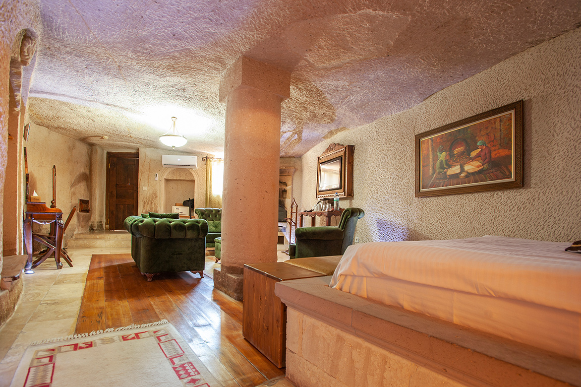 Çift kişilik süper büyük boy yatağı, şöminesi ve hamam tarzı banyosuyla küçük kaya oyma bir suit. Oda toplam 40 metrekareden oluşmaktadır.
