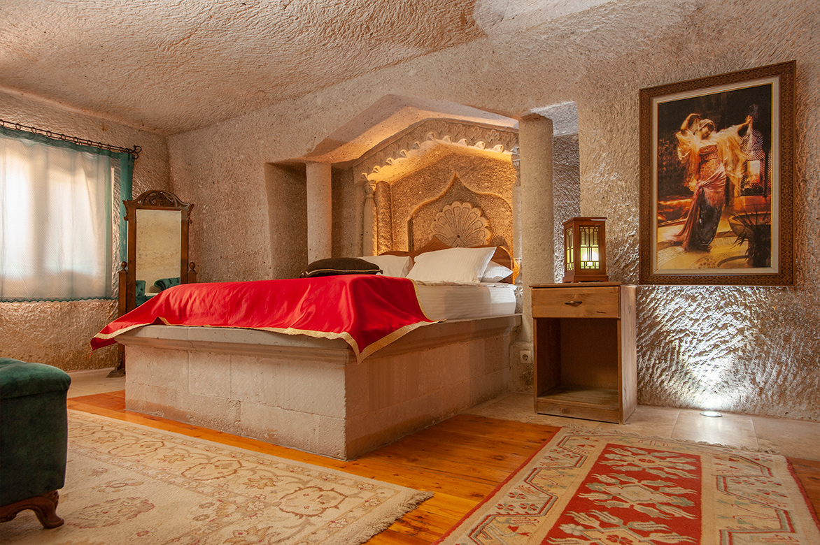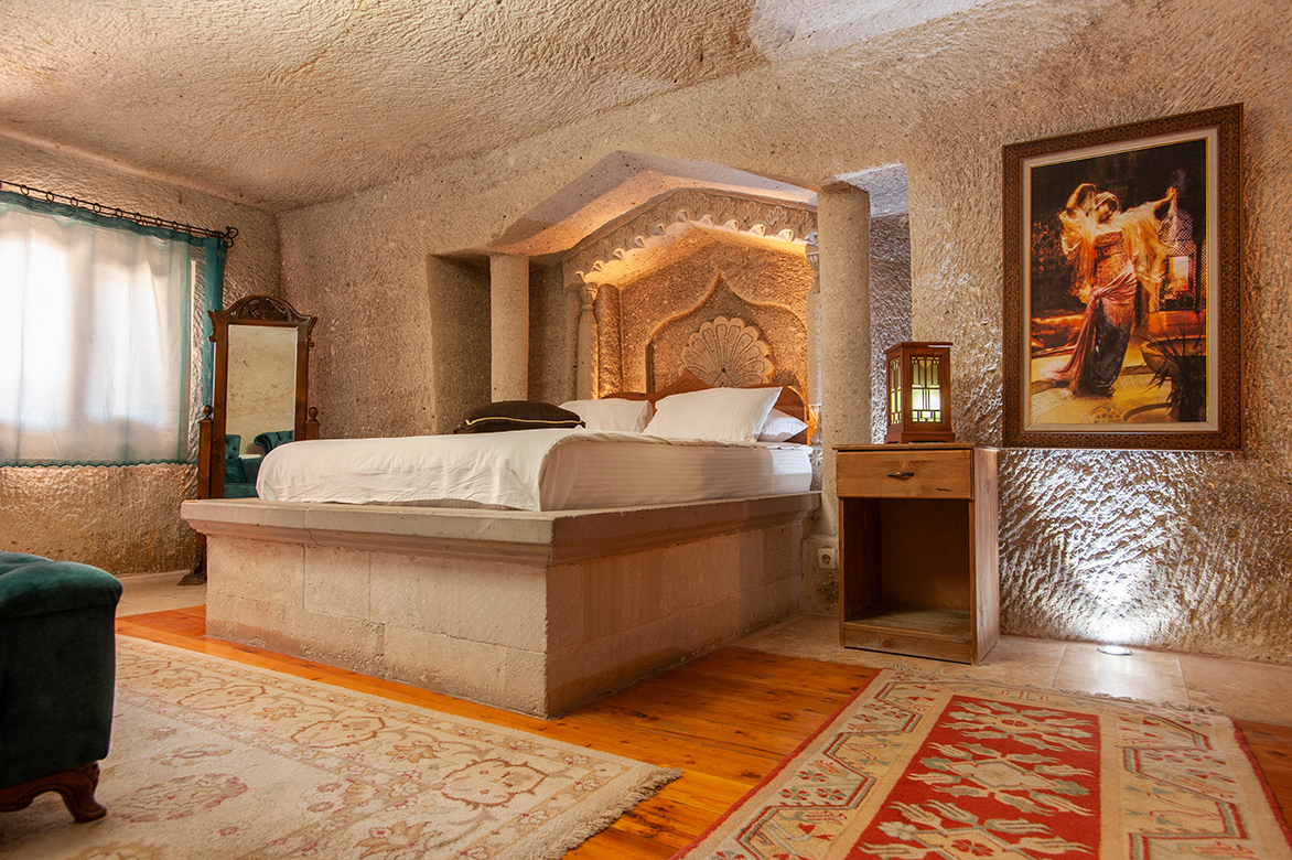 Çift kişilik süper büyük boy ve kraliçe boy yatakları ve geniş, hamam tarzı banyosuyla küçük kaya oyma bir suit.