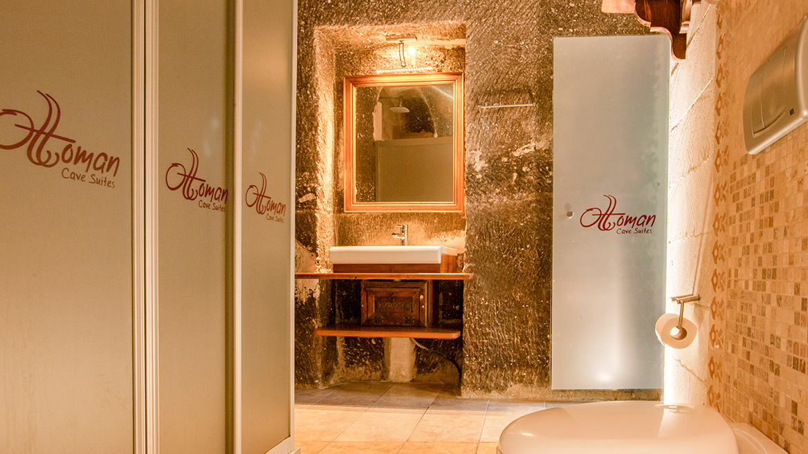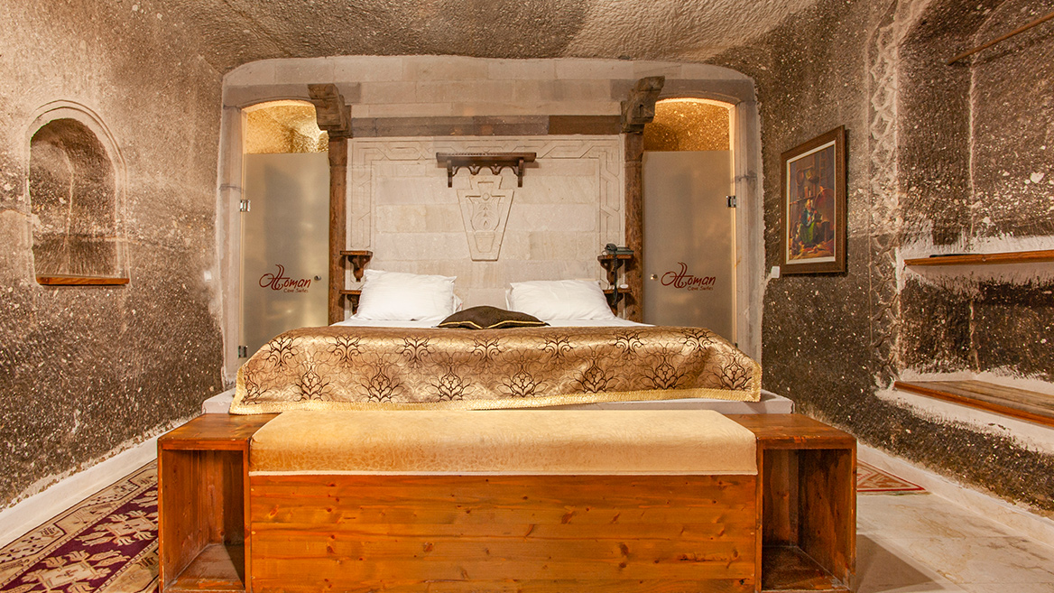 A rock-carved room with two bathrooms and a super-sized double bed. The room is 28 square meters in total and also offers a fireplace.