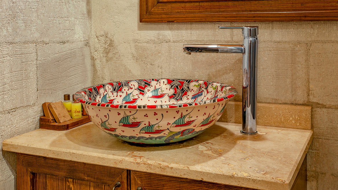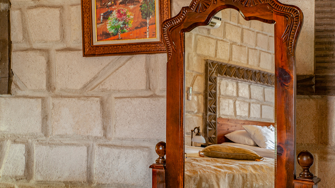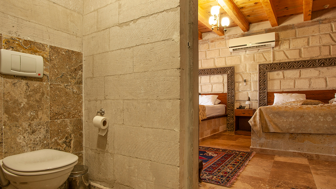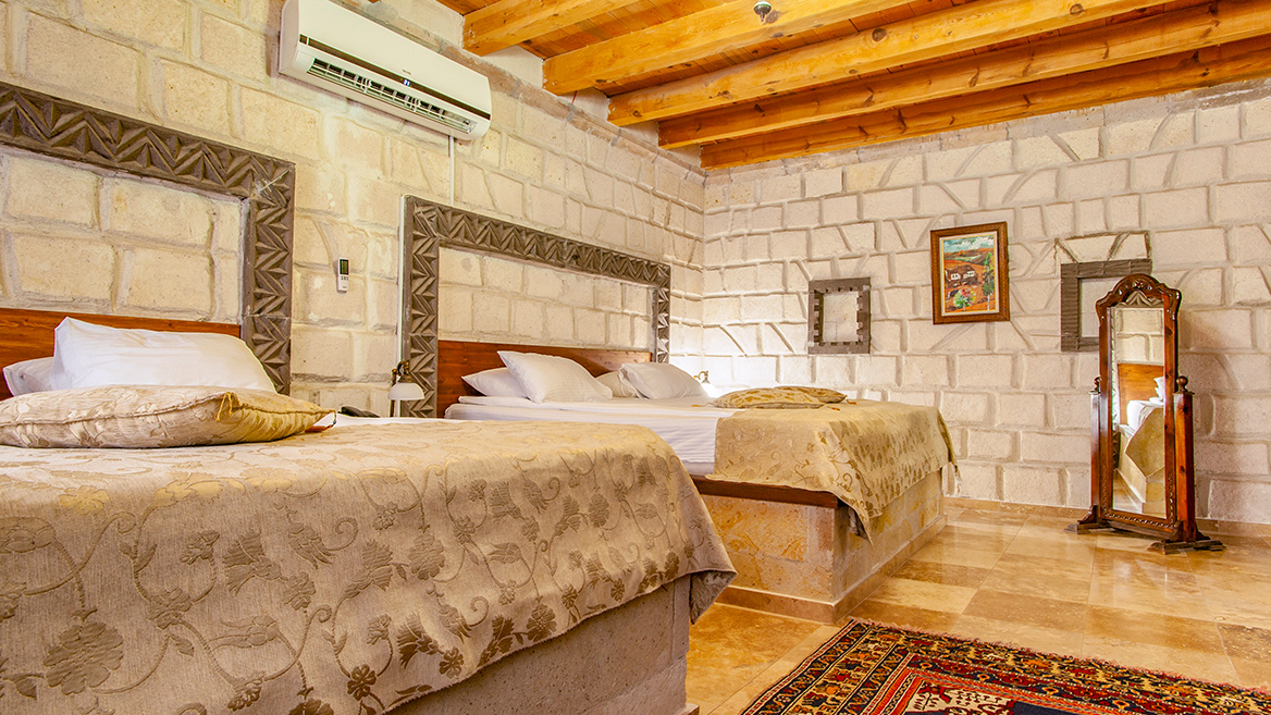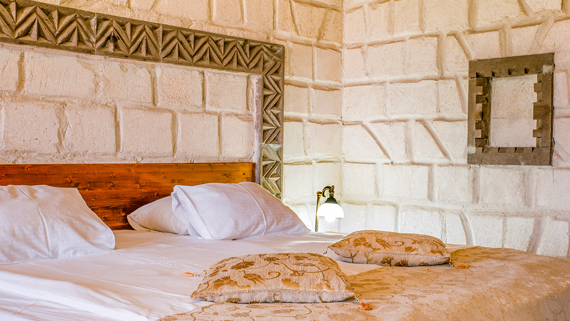 A standard stone room on the top floor with a super-sized double bed and a view of Uch Hisar Castle.