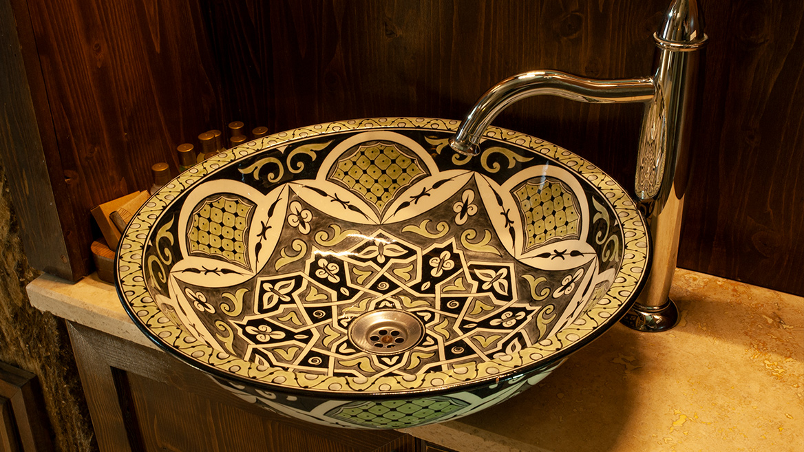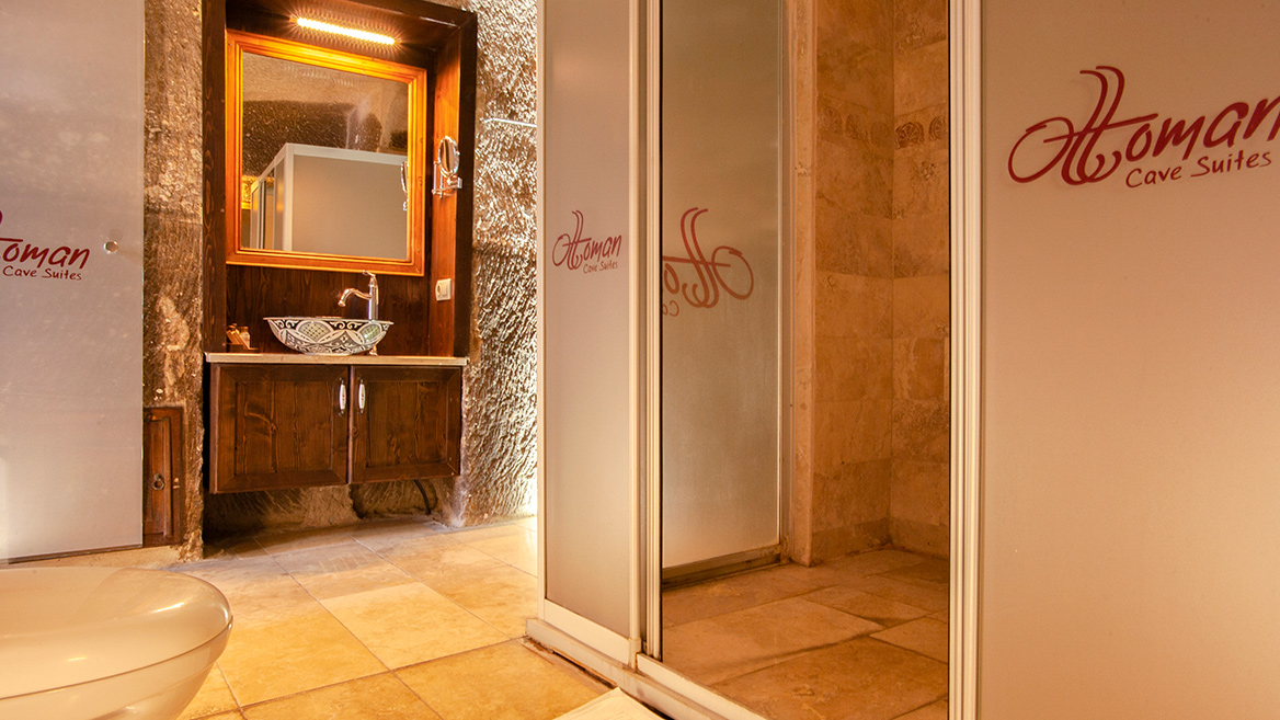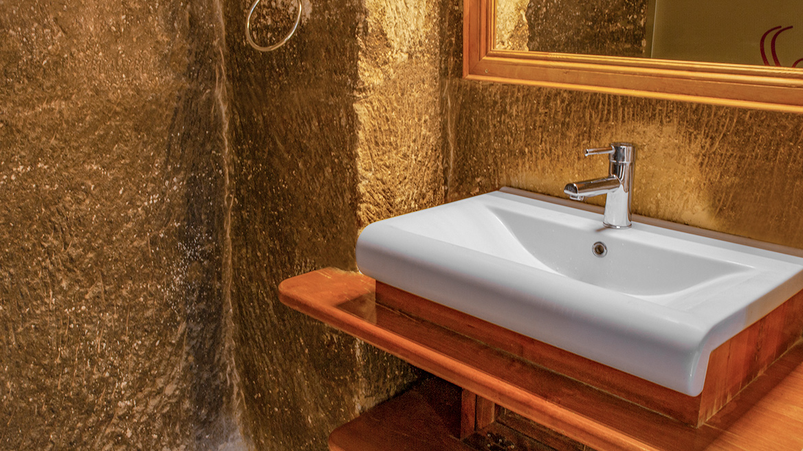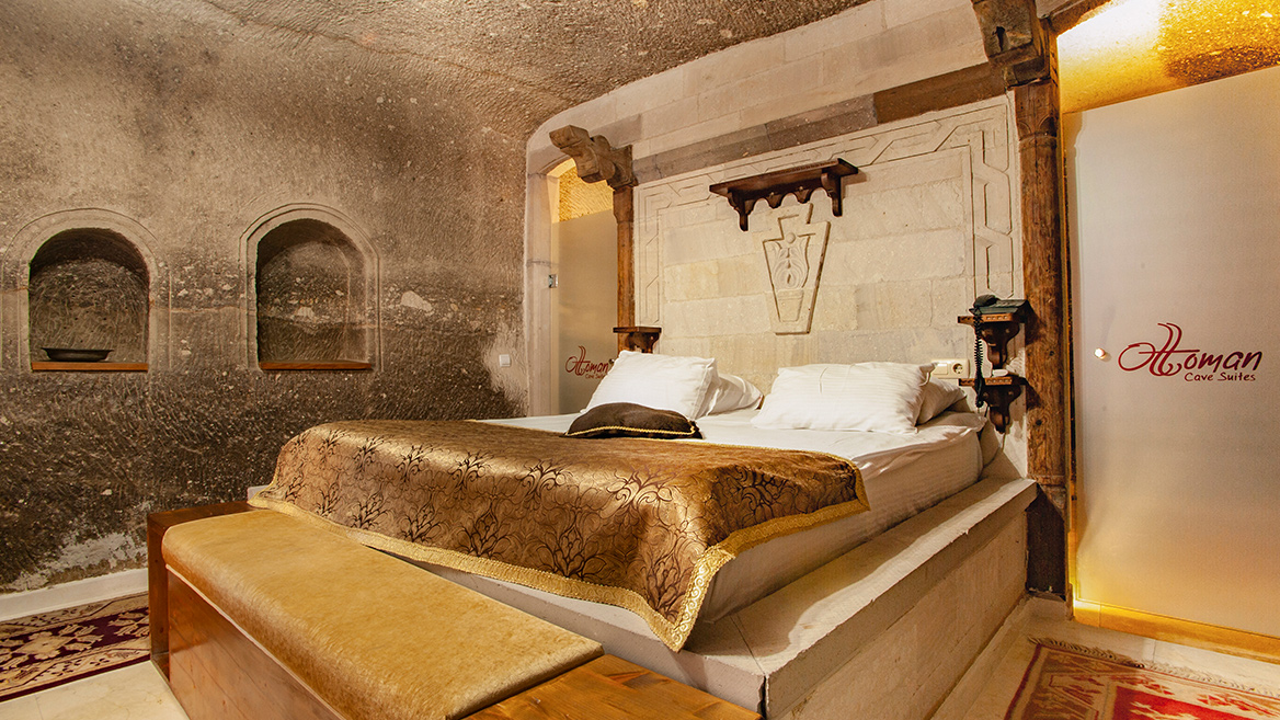 Um quarto esculpido na rocha com dois banheiros e uma cama de casal enorme. A sala tem 28 m² no total e também dispõe de lareira.
