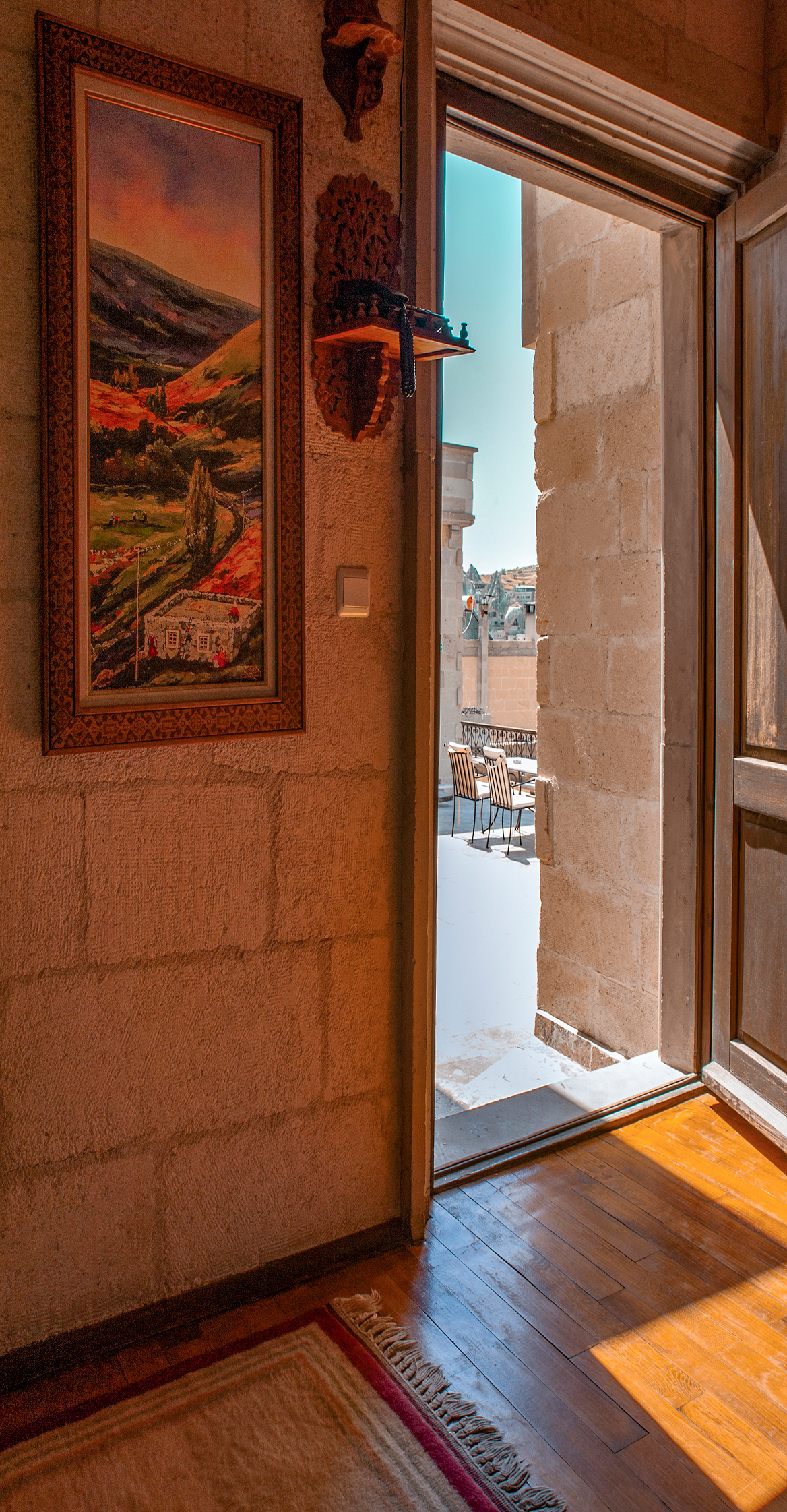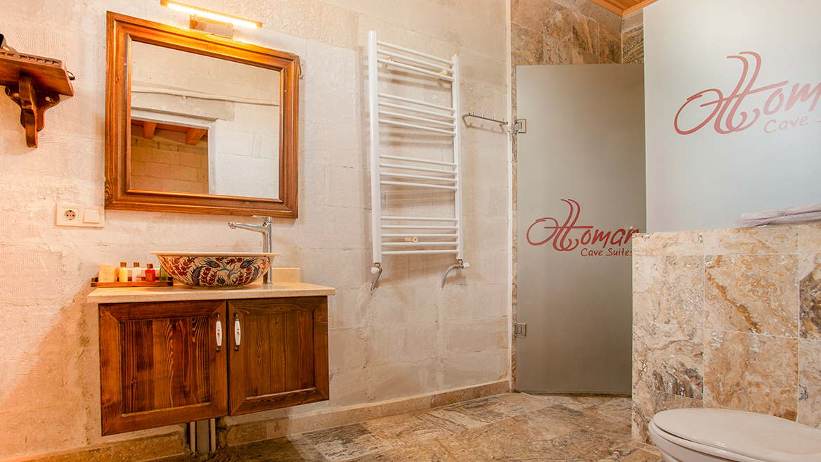 Quarto standard em pedra no último andar, com duas camas supergrandes e queen-size e vista para os Vales Red Pit e Güllüdere.