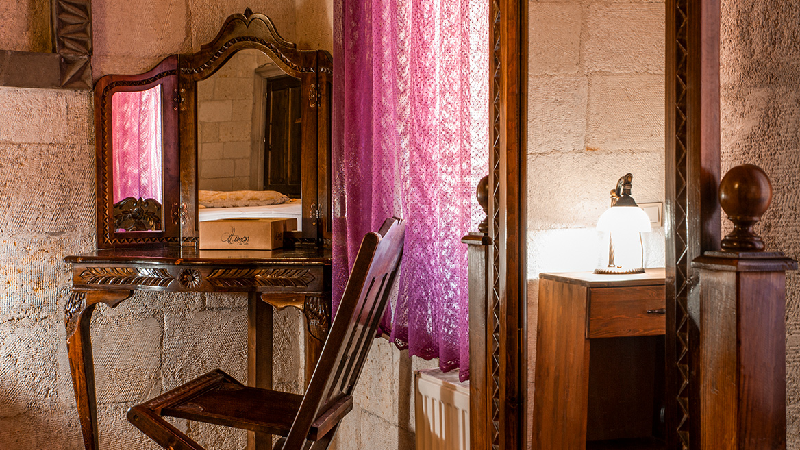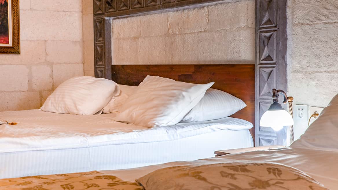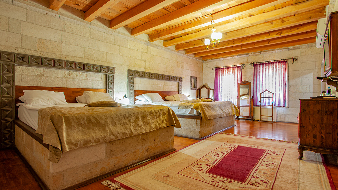 Çift kişilik süper büyük boy ve kraliçe boy iki yatak ve Kızıl çukur ile Güllü dere Vadilerinden bir kesitle, en üst katta standart bir taş oda.