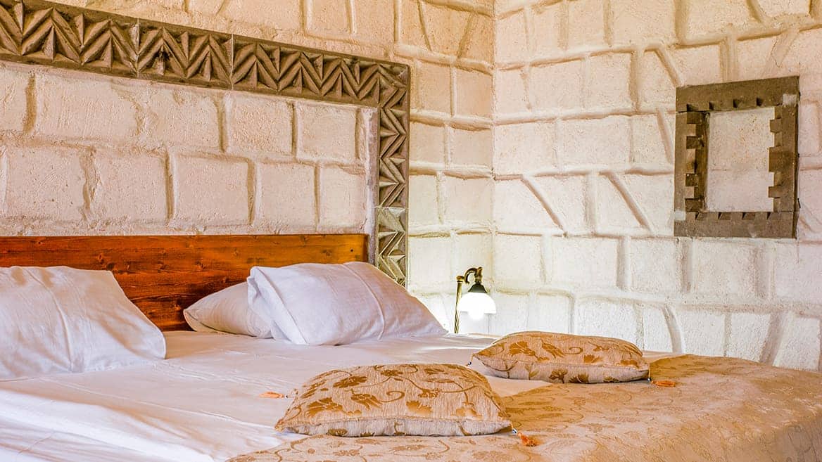 Çift kişilik süper büyük boy yatak ve Uç Hisar Kalesi manzarasından bir kesitle, en üst katta standart bir taş oda.