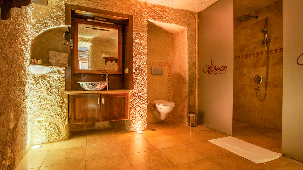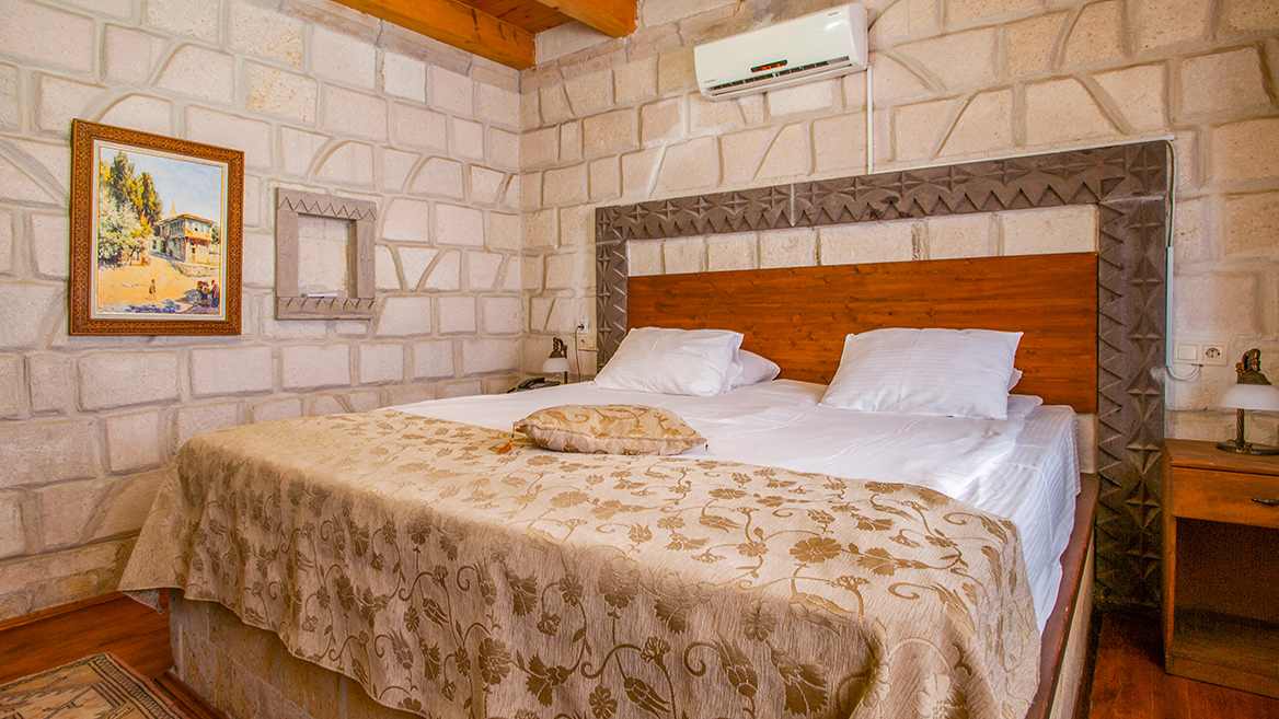 Çift kişilik süper büyük boy yatak ve Uç Hisar Kalesi manzarasından bir kesitle, en üst katta standart bir taş oda.