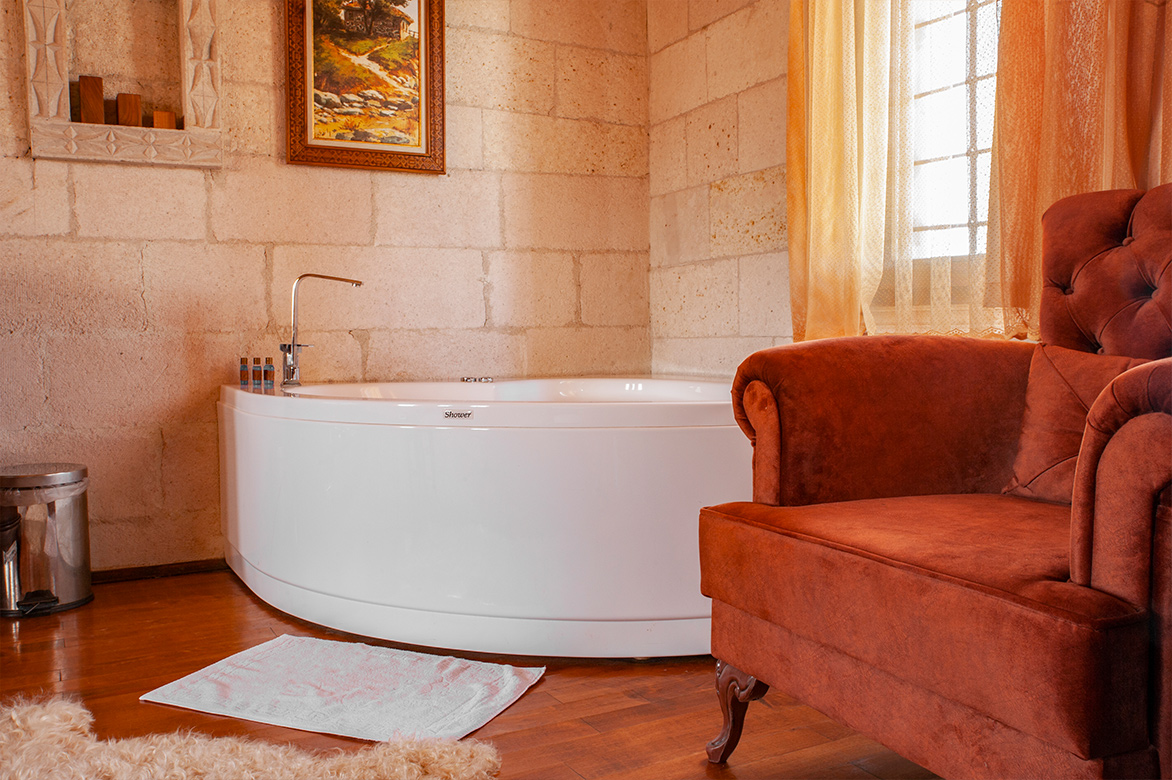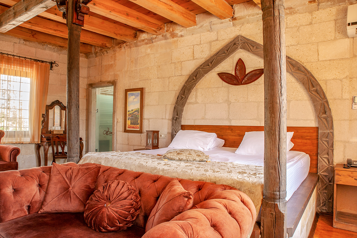 Çift kişilik süper büyük boy yatak ve Uçhisar Kalesi, Kızılçukur Vadisi ve Güllüdere Vadisi manzaralarından bir kesitle, en üst katta standart küçük bir taş suit.